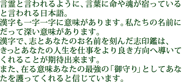 万物に、命の輝きを観る日本人の感性を取り戻し、一本の印鑑に魂を込めて日本に世界に拡げ、「志」持つ人を創り出します。